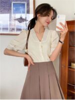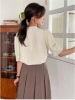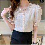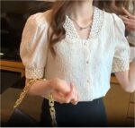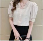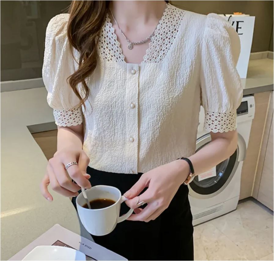 Elevate your wardrobe with this exquisite white textured blouse that beautifully combines vintage charm with contemporary style. The delicate lace collar adds a sophisticated touch, while the carefully crafted puff sleeves create a romantic silhouette. The textured fabric provides visual interest and a premium feel, complemented by classic button-down closures that offer both functionality and elegance. The intricate lace detailing extends to the sleeve cuffs, creating a cohesive and refined look. Perfect for both professional settings and special occasions, this blouse pairs wonderfully with tailored trousers or skirts. The thoughtfully designed square neckline frames your dƩcolletage beautifully, while the fitted silhouette ensures a flattering fit. The white colour offers versatile styling options, making it a timeless addition to any fashion-forward wardrobe. The puff sleeves provide just the right amount of drama without overwhelming your overall look. This blouse seamlessly bridges the gap between vintage-inspired design and modern sophistication.