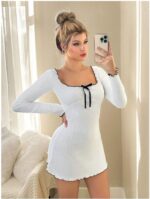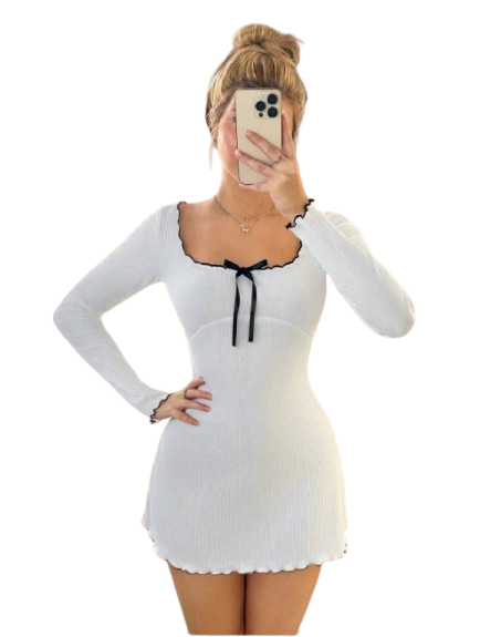 Featuring a stylish square neckline with contrast bow detail and full-length sleeves, this mini dress gives a modern and feminine touch. The body-hugging silhouette and above-knee length make it perfect for date nights, parties, casual outings, and special occasions.