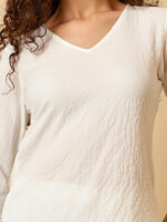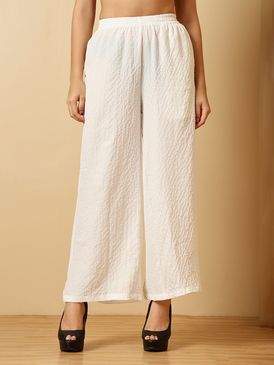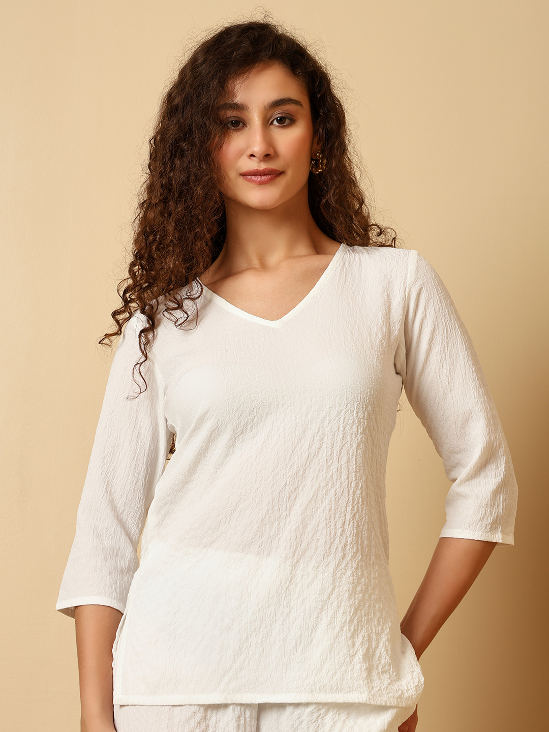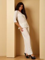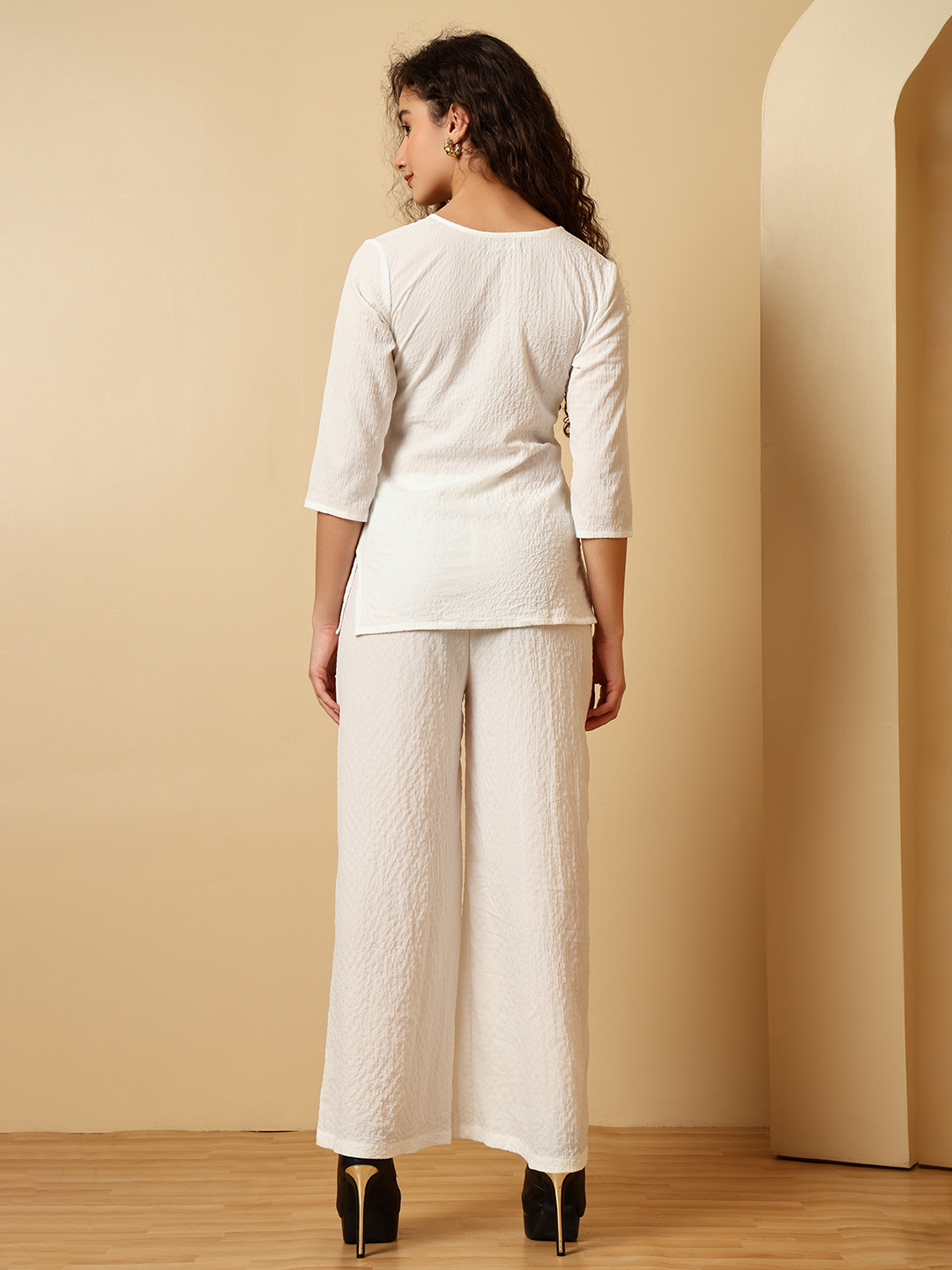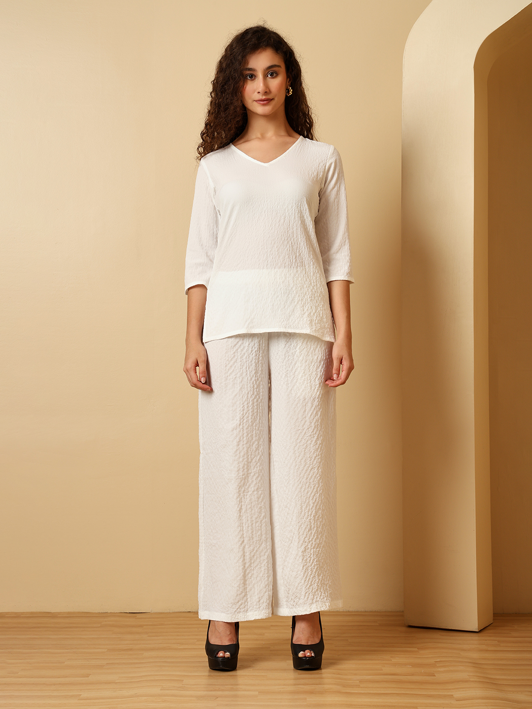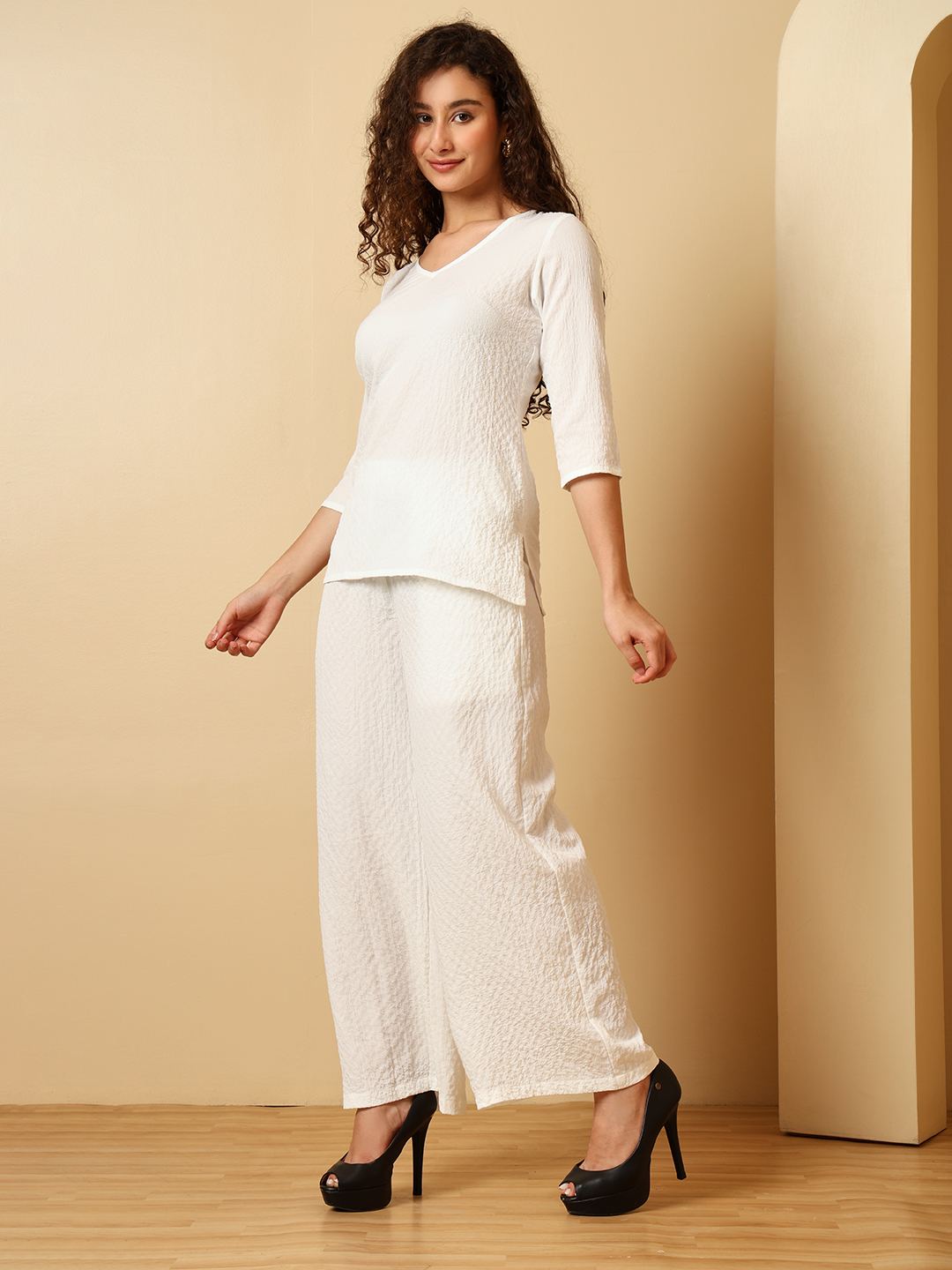 Women’s White Textured Co-ord Set with 3/4th Sleeve Top & Wide-Leg Pants